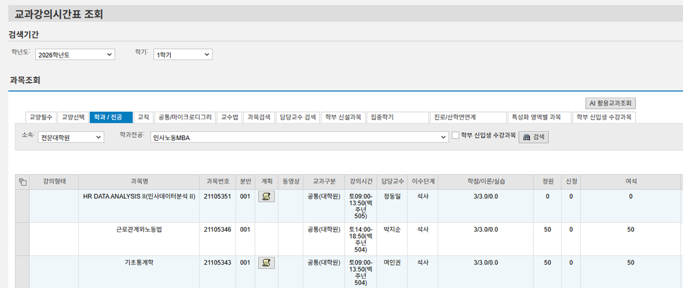 숙명포털(portal.sookmyung.ac.kr) > 강의시간표 > [소속] 전문대학원, [학과전공] 인사노동MBA(DBA) > 검색